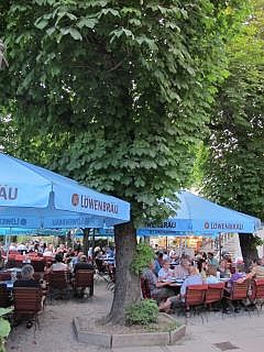 In de Biergarten van Löwenbrau zijn er onder de kastanjebomen zo'n duizend zitplaatsen. Het is er zelfbediening maar er loopt ook bedienend personeel rond.